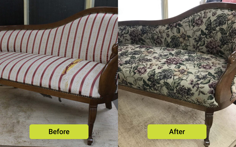 ほとんどが生地で覆われているため、張り替えると印象が大きく変わり、ほぼ新品のように見違えます。 これだけ大きいと布の面積も大きいため、生地の色や印象を変えることで、空間全体の雰囲気にも影響します。